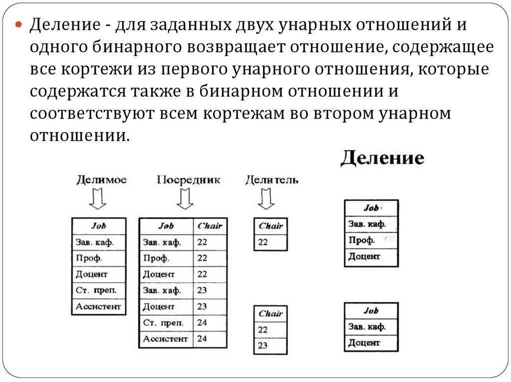 Деление - для заданных двух унарных отношений иодного бинарного возвращает отношение, содержащее