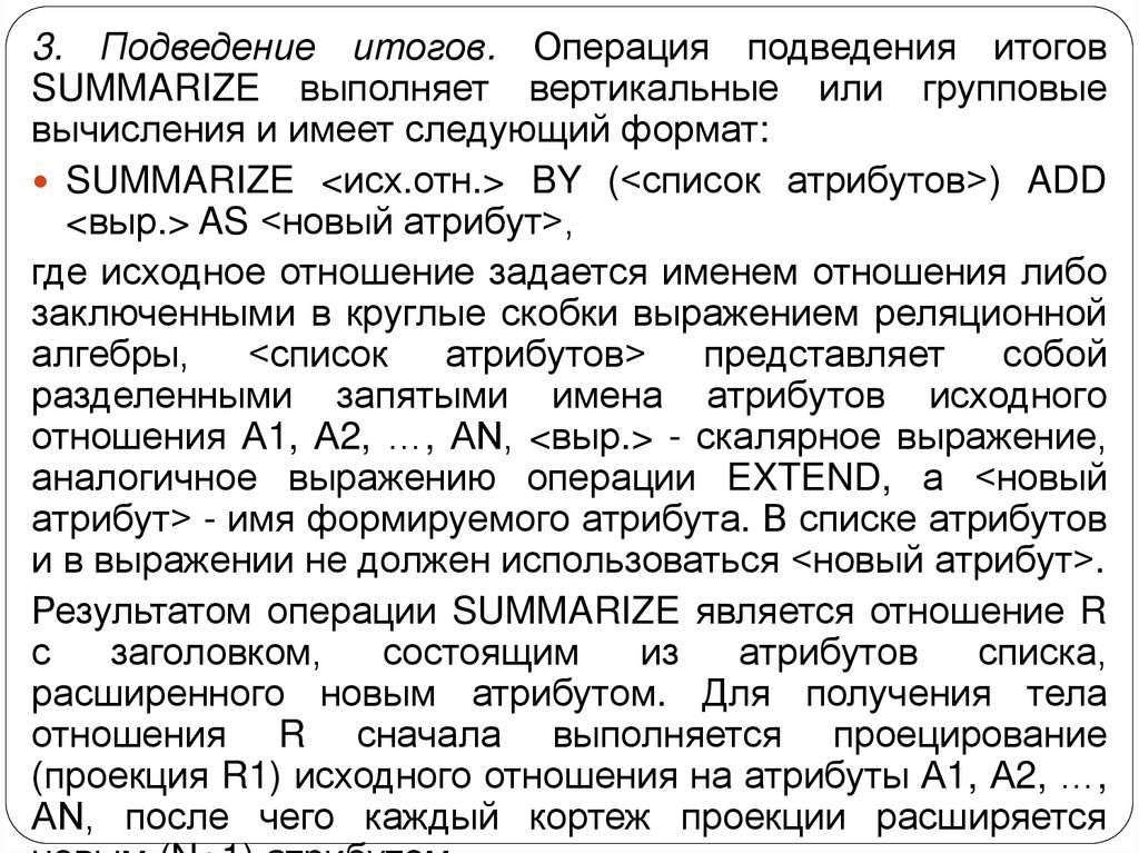 3. Подведение итогов. Операция подведения итоговSUMMARIZE выполняет вертикальные или групповые
