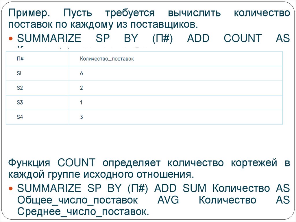 Пример. Пусть требуется вычислить количествопоставок по каждому из поставщиков.