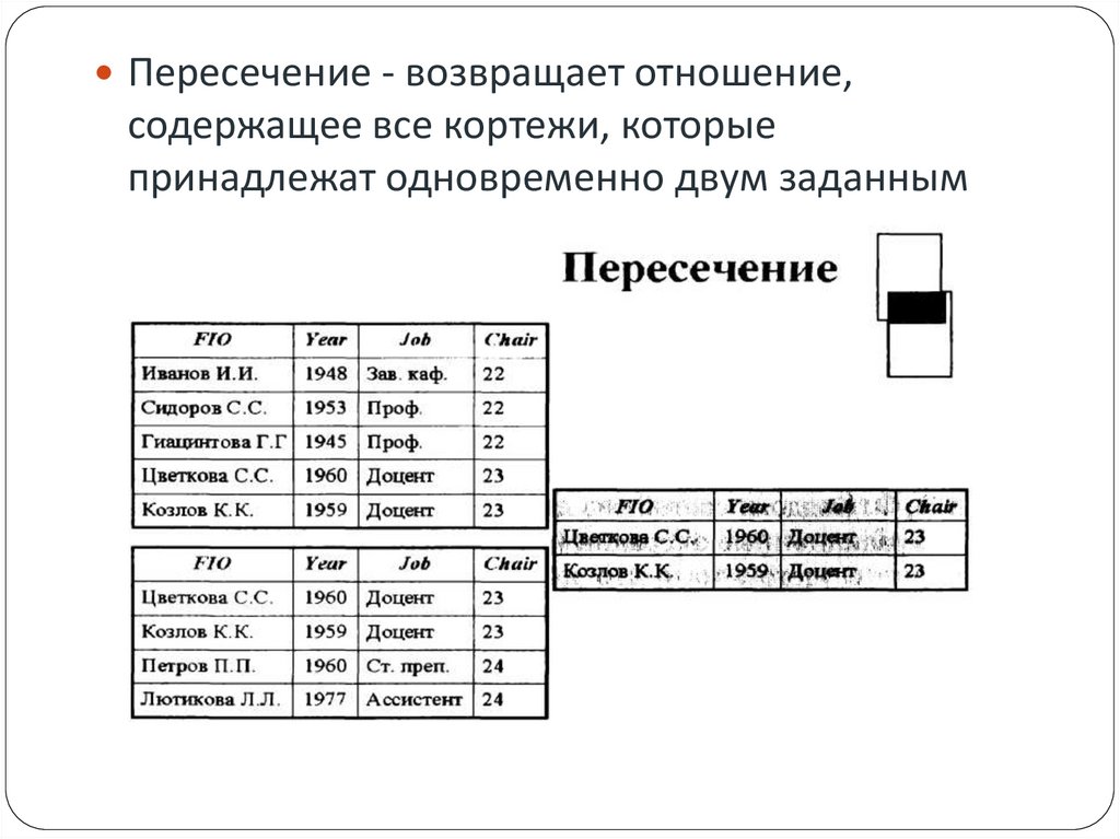 Пересечение - возвращает отношение,содержащее все кортежи, которые