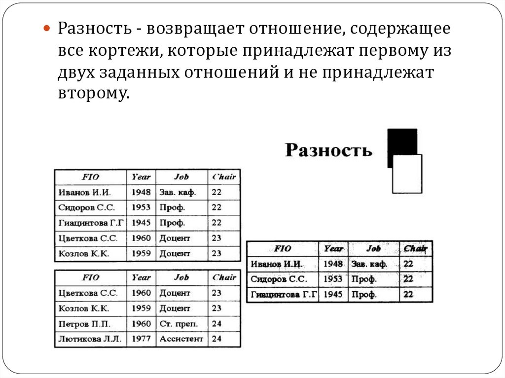 Разность - возвращает отношение, содержащеевсе кортежи, которые принадлежат первому из