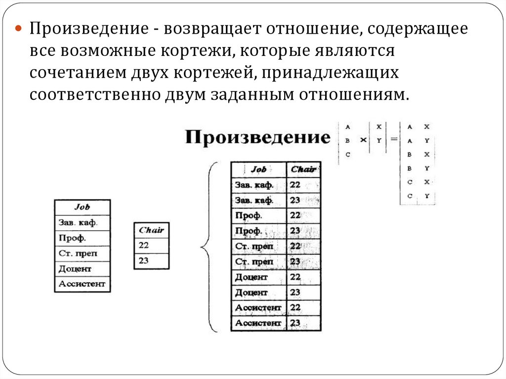 Произведение - возвращает отношение, содержащеевсе возможные кортежи, которые являются