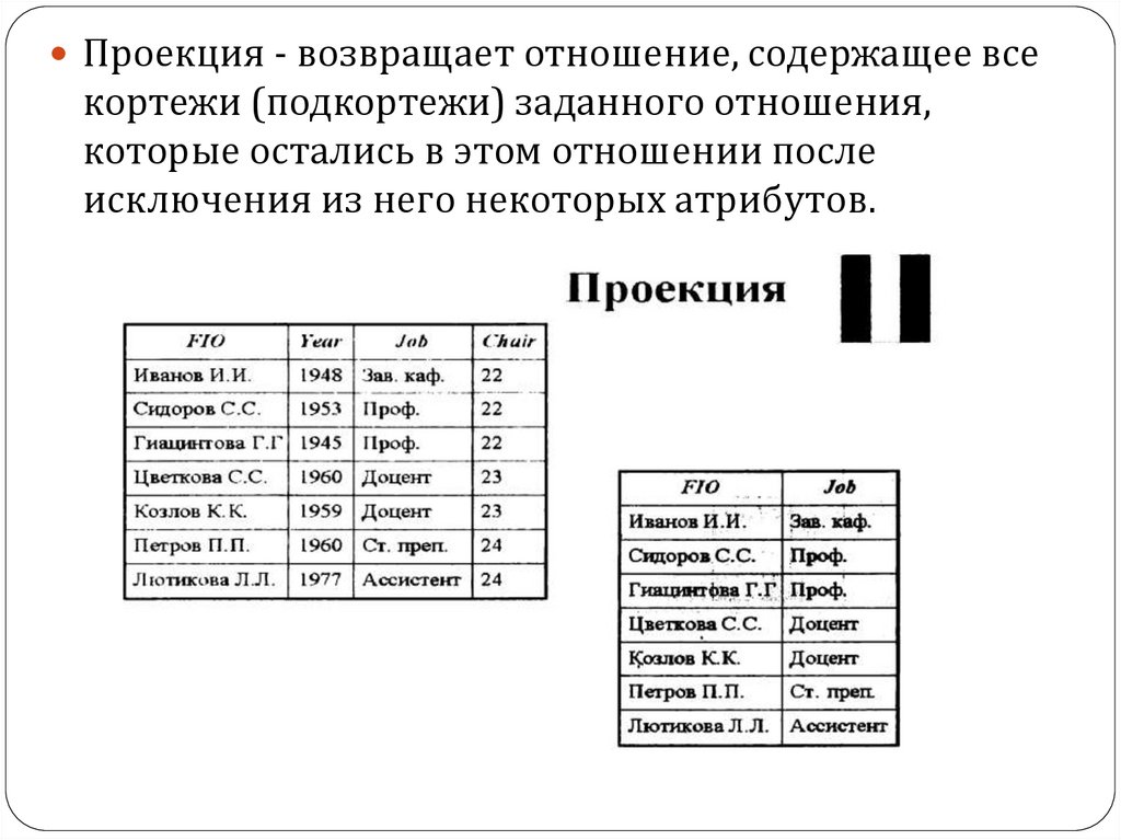 Проекция - возвращает отношение, содержащее всекортежи (подкортежи) заданного отношения,