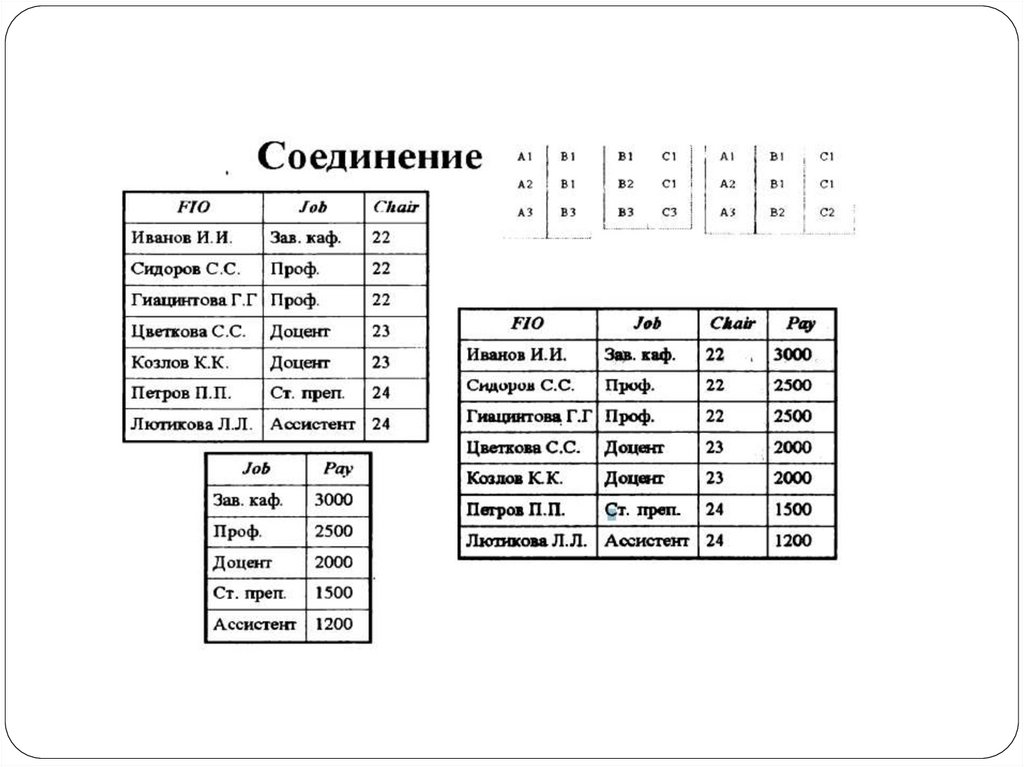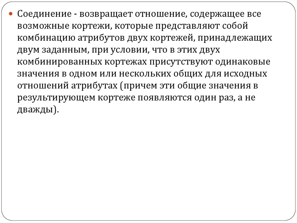 Соединение - возвращает отношение, содержащее всевозможные кортежи, которые представляют собой