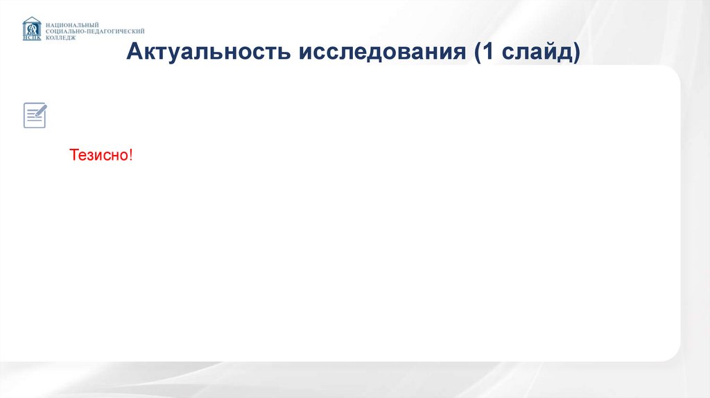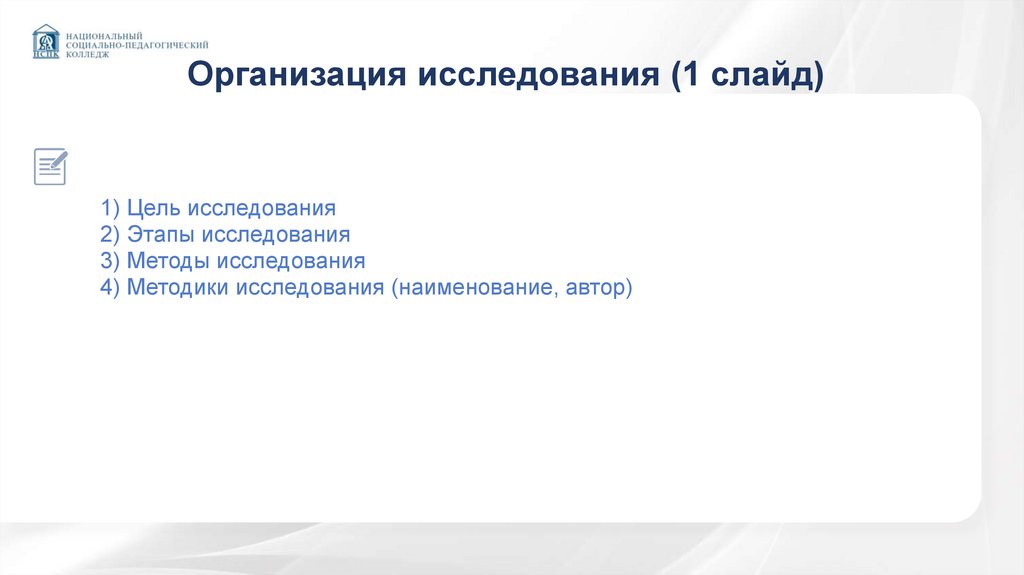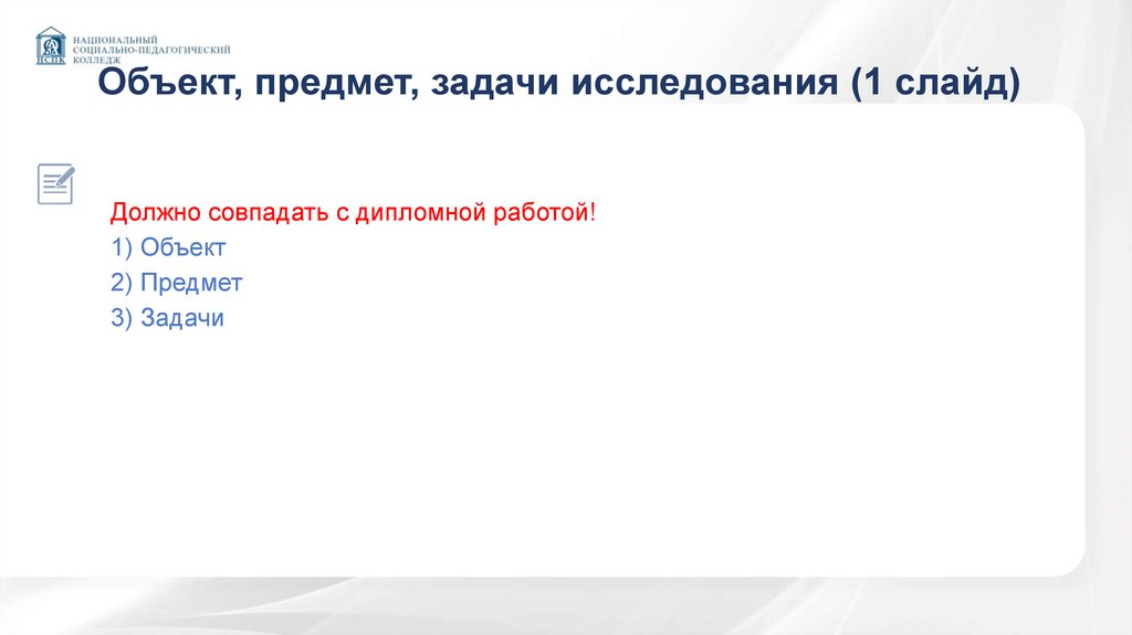 Объект, предмет, задачи исследования (1 слайд)Должно совпадать с дипломной работой!