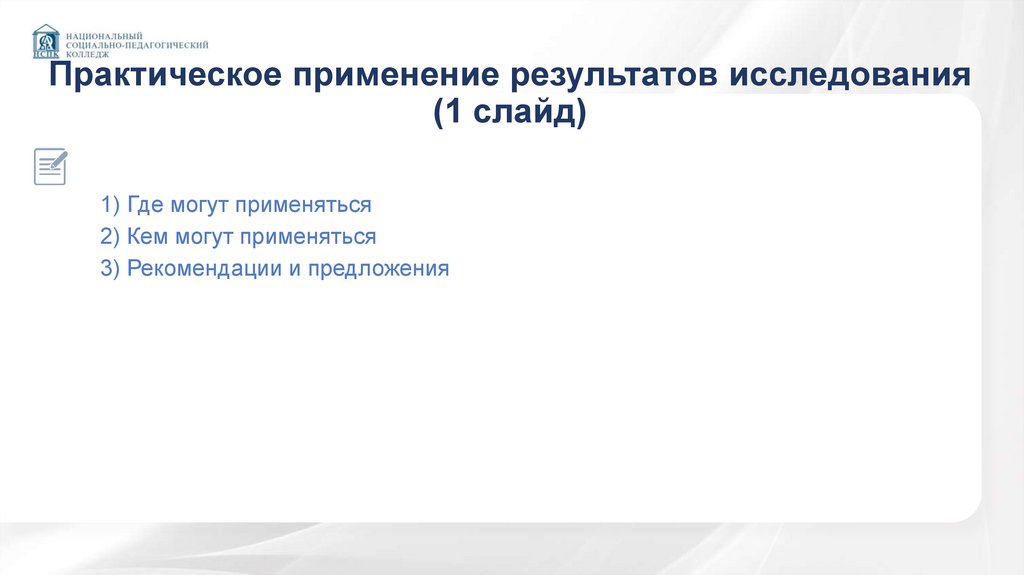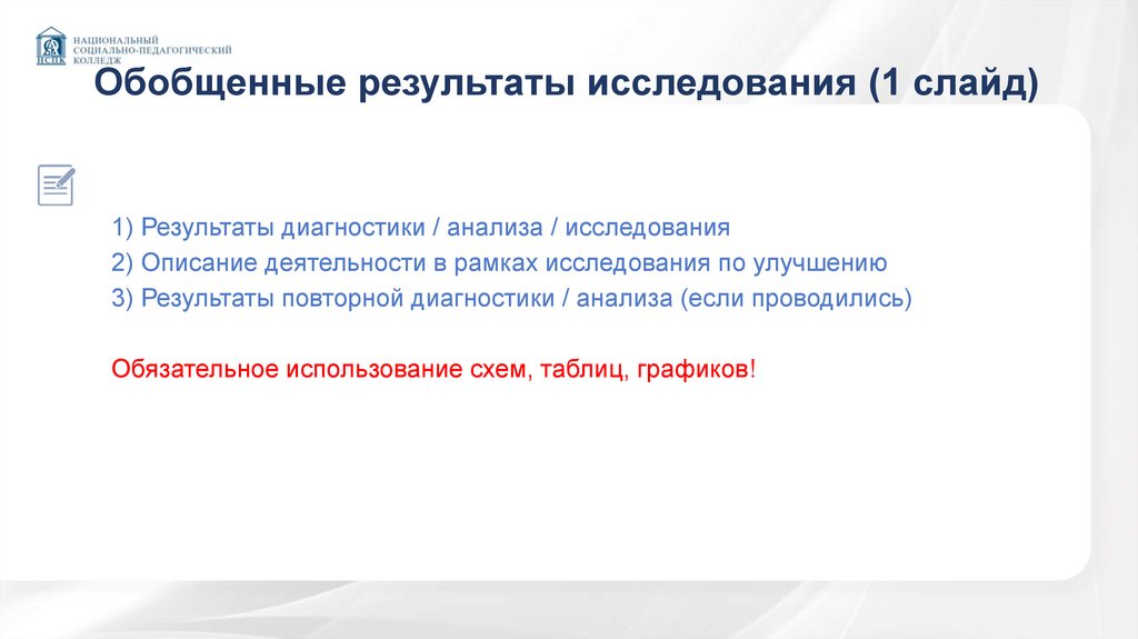 Обобщенные результаты исследования (1 слайд)1) Результаты диагностики / анализа / исследования