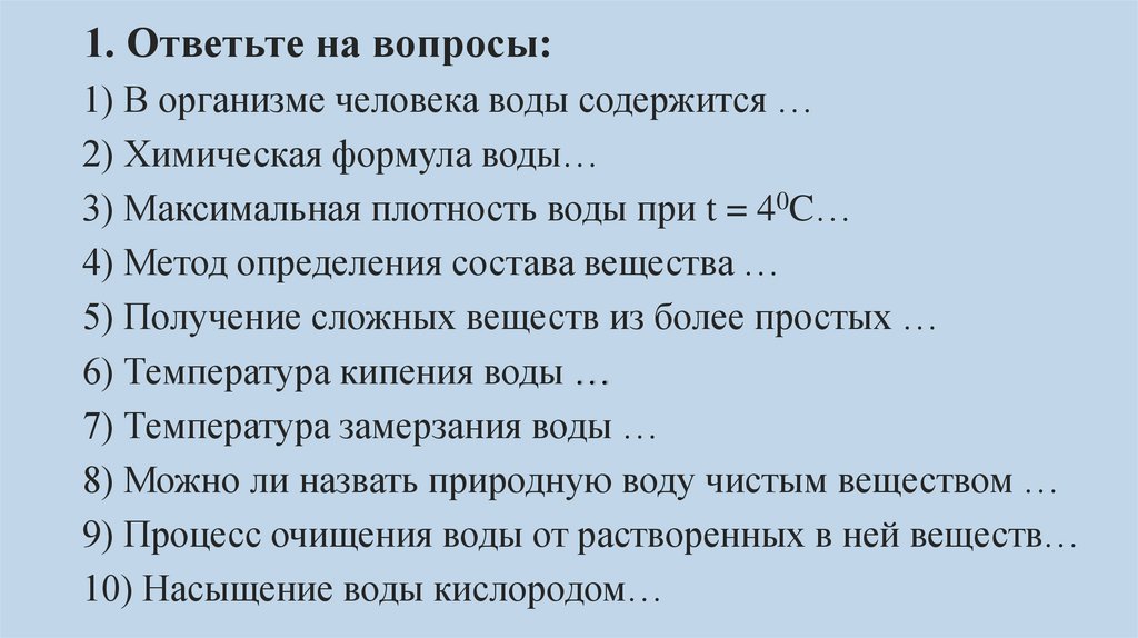 1. Ответьте на вопросы:1) В организме человека воды содержится …