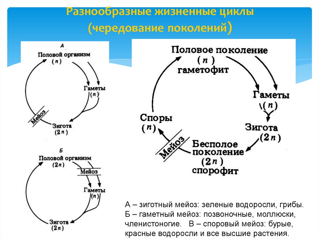 А – зиготный мейоз: зеленые водоросли, грибы.Б – гаметный мейоз: позвоночные, моллюски,
