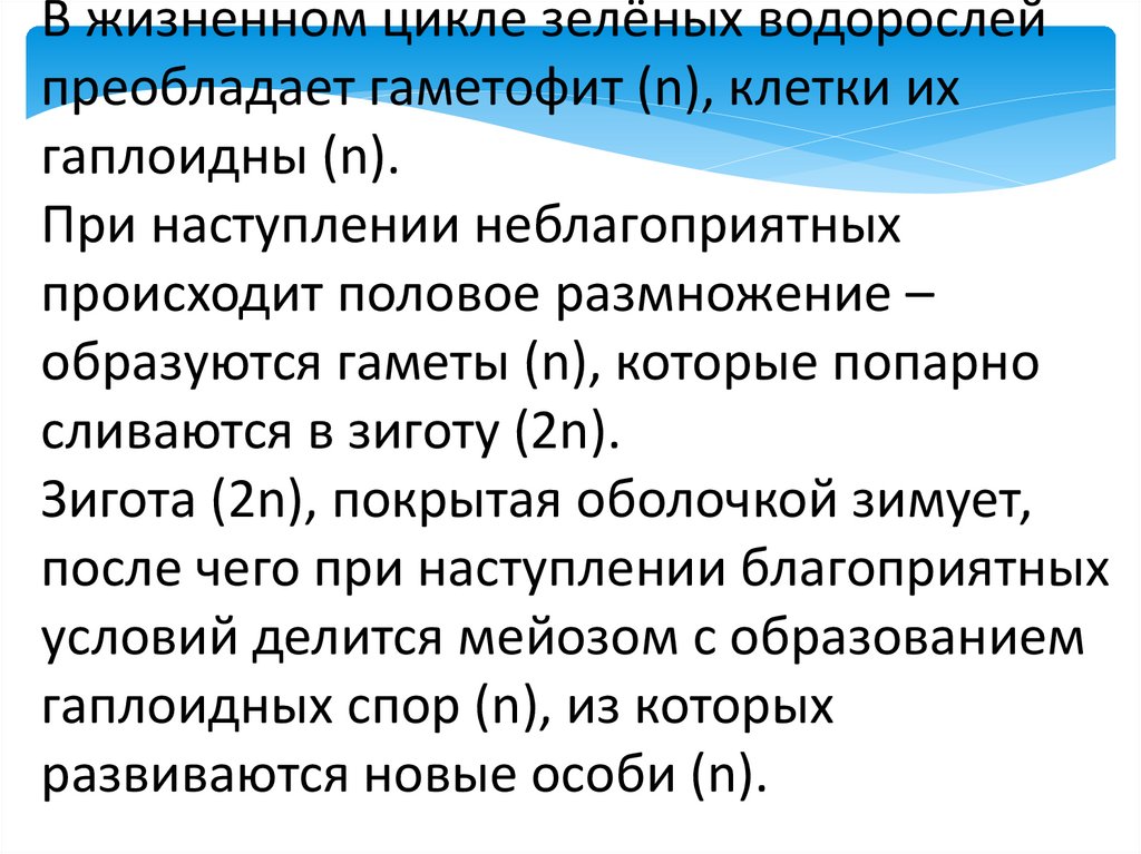 В жизненном цикле зелёных водорослейпреобладает гаметофит (n), клетки их