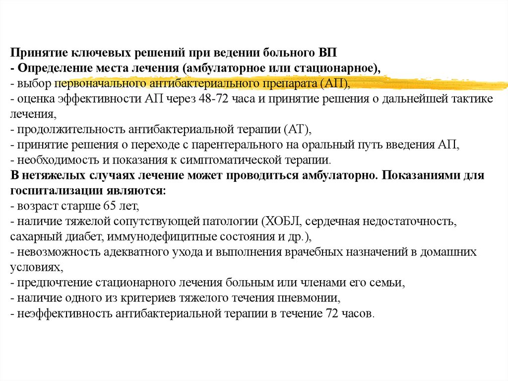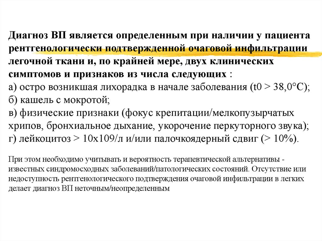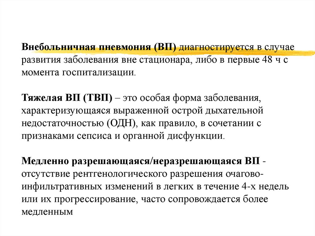 Внебольничная пневмония (ВП) диагностируется в случаеразвития заболевания вне стационара, либо в первые 48 ч с