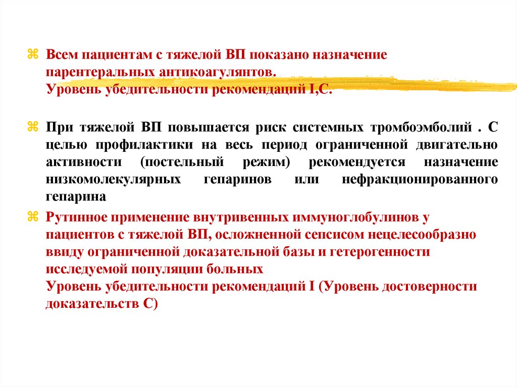 Всем пациентам с тяжелой ВП показано назначениепарентеральных антикоагулянтов.