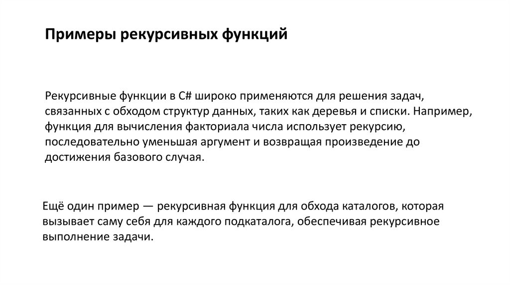 Примеры рекурсивных функцийРекурсивные функции в C# широко применяются для решения задач,
