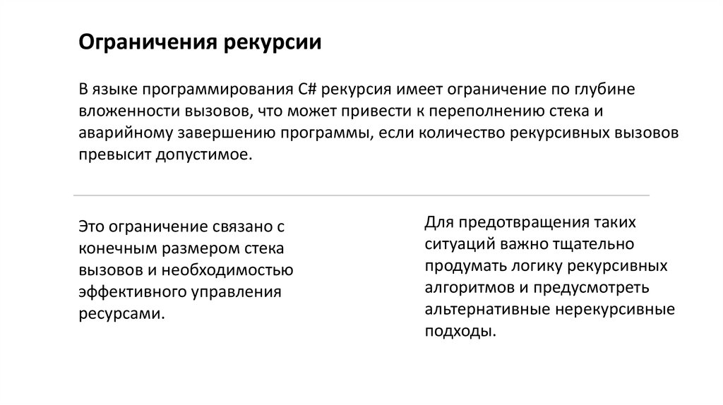 Ограничения рекурсииВ языке программирования C# рекурсия имеет ограничение по глубине