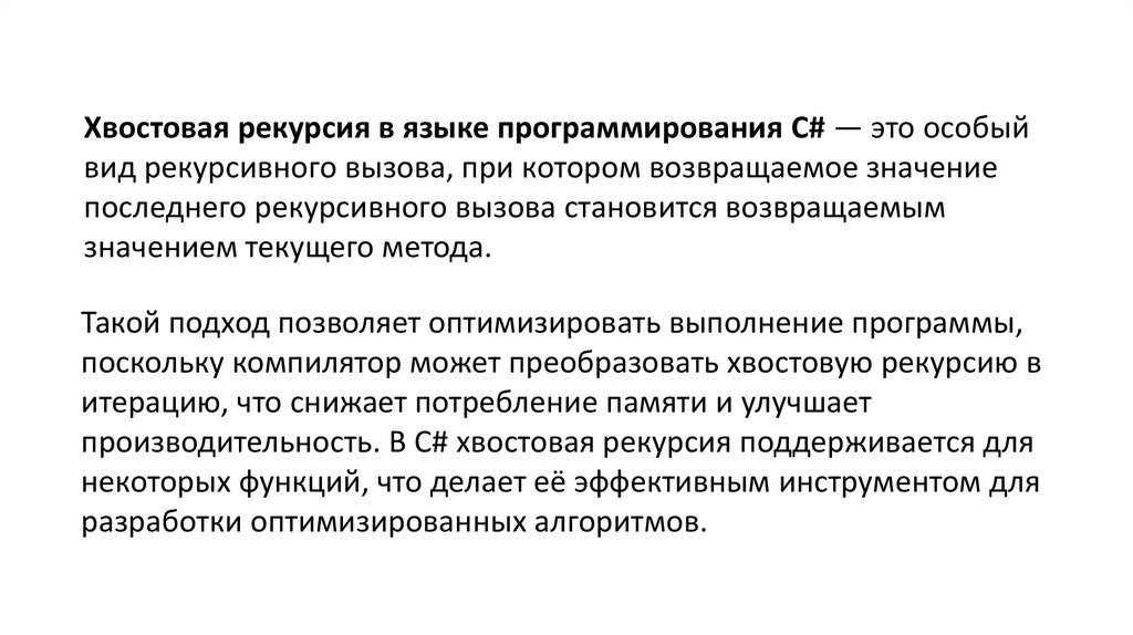 Хвостовая рекурсия в языке программирования C# — это особыйвид рекурсивного вызова, при котором возвращаемое значение