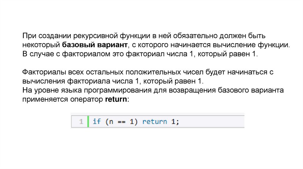 При создании рекурсивной функции в ней обязательно должен бытьнекоторый базовый вариант, с которого начинается вычисление функции.