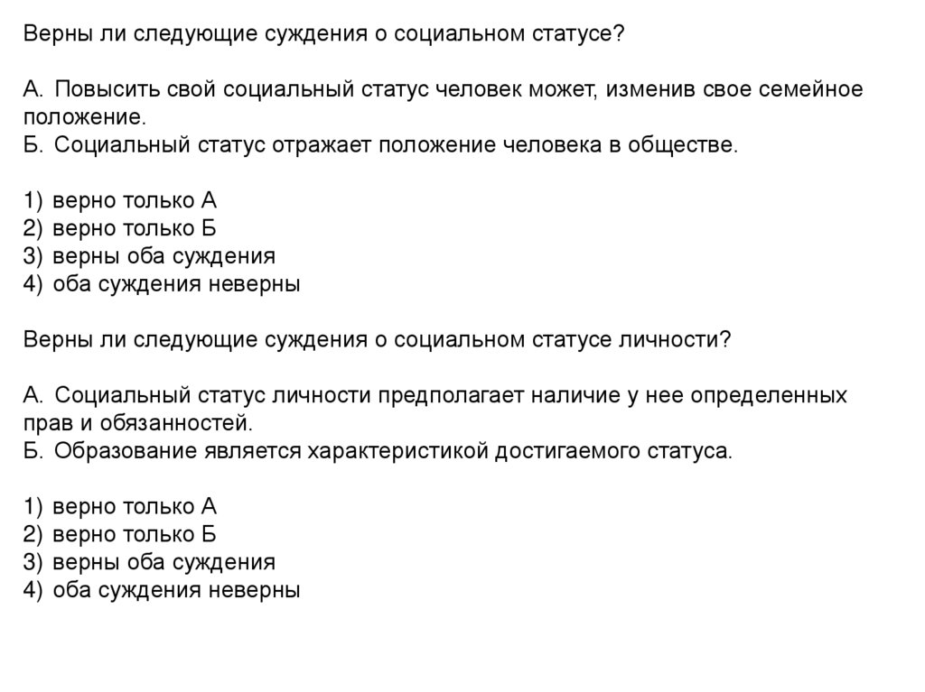 Верны ли следующие суждения о социальном статусе?А. Повысить свой социальный статус человек может, изменив свое семейное