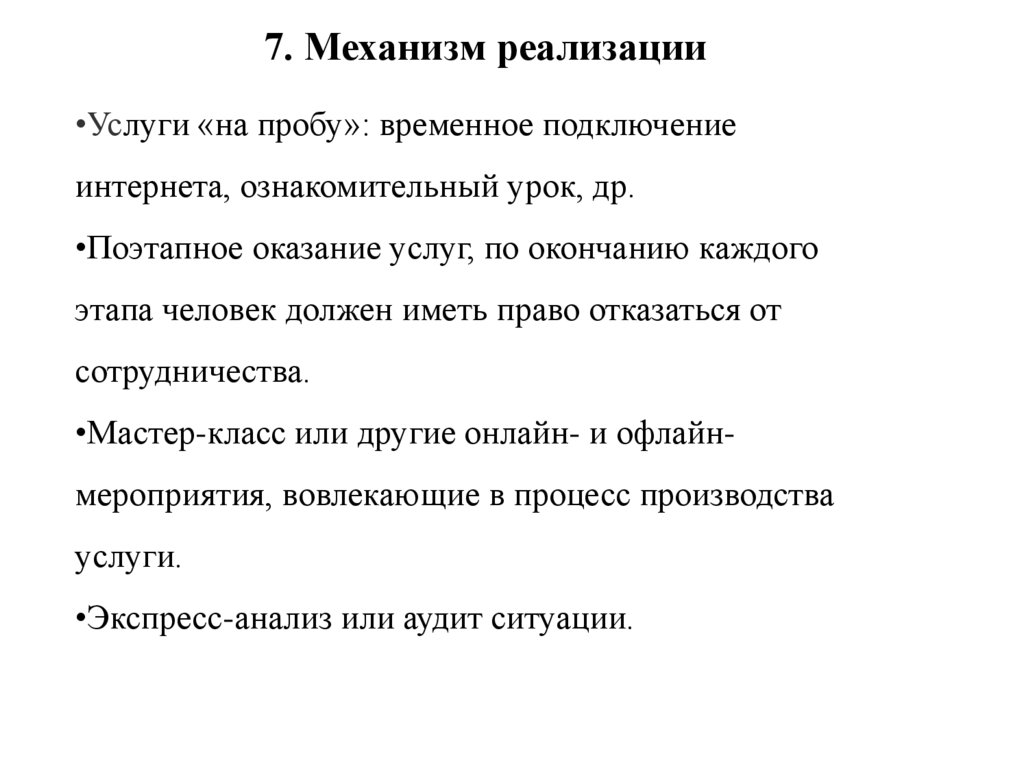 7. Механизм реализации•Услуги «на пробу»: временное подключение
