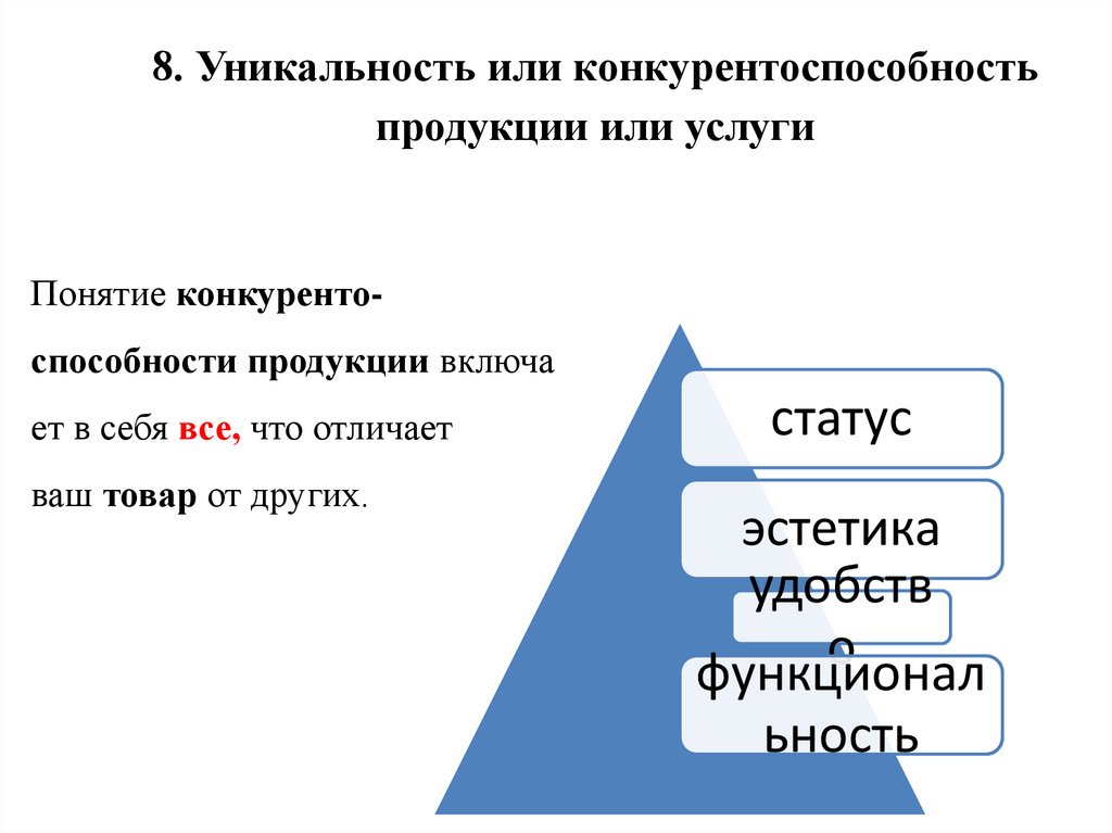 8. Уникальность или конкурентоспособностьпродукции или услуги