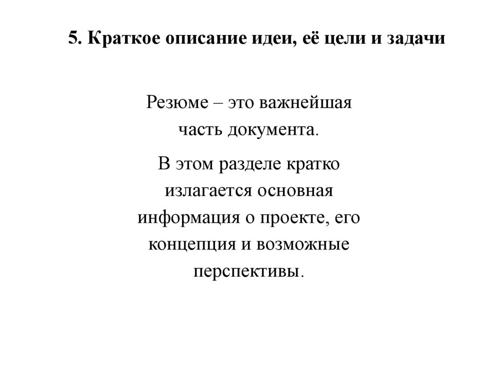 5. Краткое описание идеи, её цели и задачиРезюме – это важнейшая