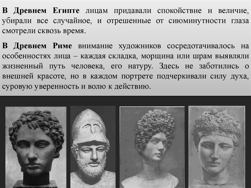 В Древнем Египте лицам придавали спокойствие и величие,убирали все случайное, и отрешенные от сиюминутности глаза