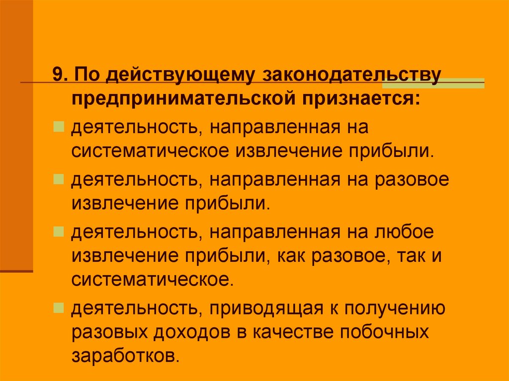 9. По действующему законодательствупредпринимательской признается:
