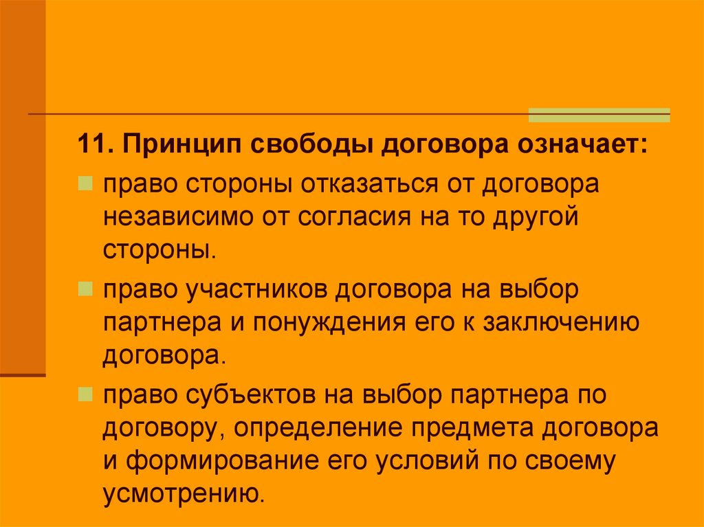 11. Принцип свободы договора означает:право стороны отказаться от договора