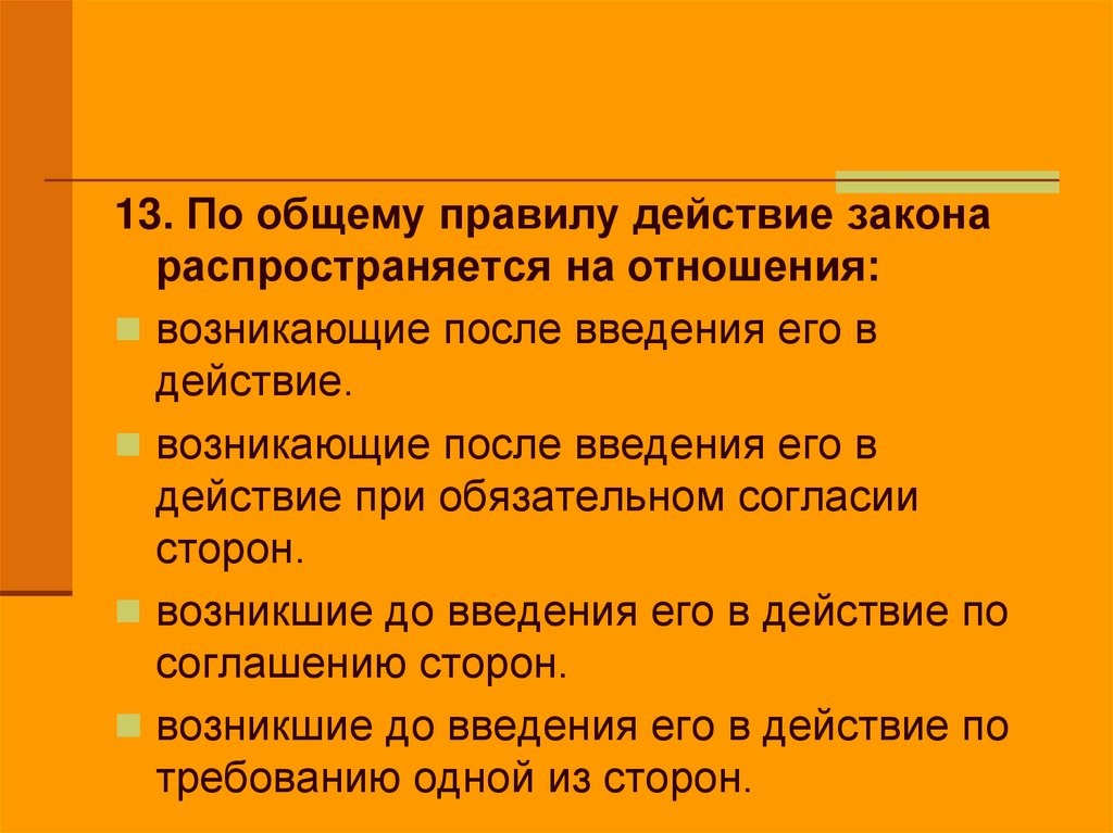 13. По общему правилу действие законараспространяется на отношения: