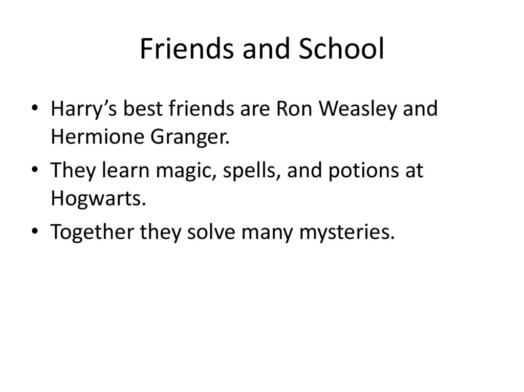 Friends and School• Harry’s best friends are Ron Weasley and