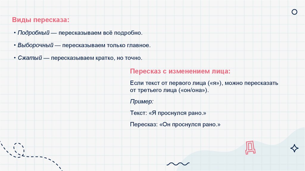 Виды пересказа:• Подробный — пересказываем всё подробно.