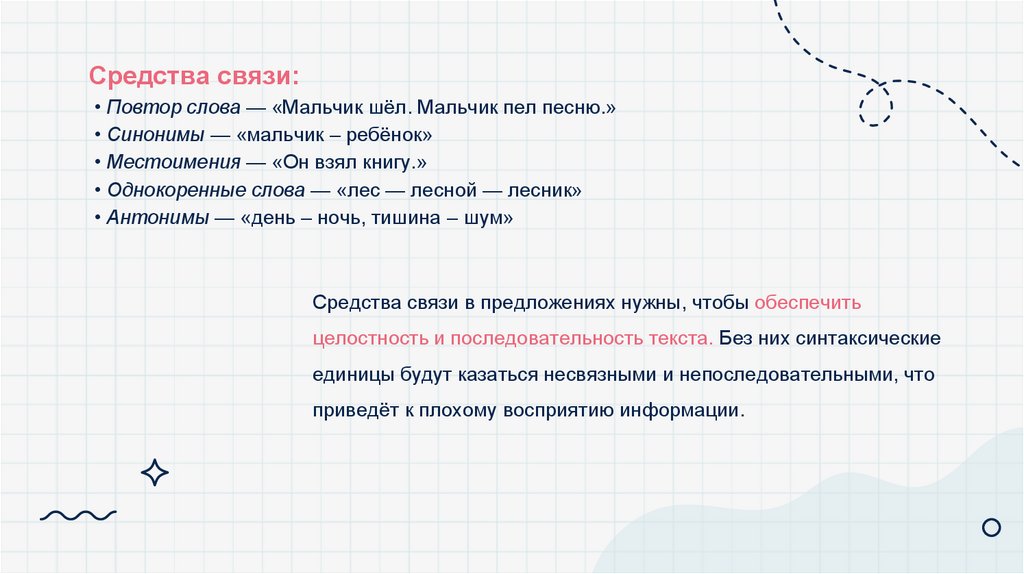Средства связи:• Повтор слова — «Мальчик шёл. Мальчик пел песню.»