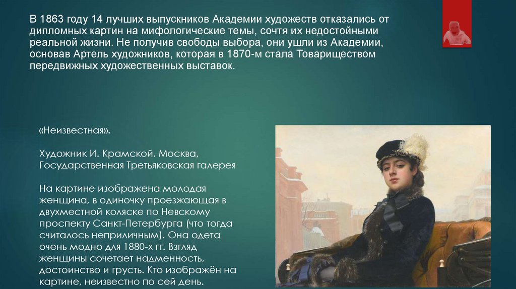 В 1863 году 14 лучших выпускников Академии художеств отказались отдипломных картин на мифологические темы, сочтя их недостойными