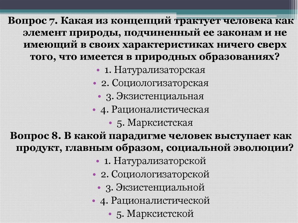 Вопрос 7. Какая из концепций трактует человека какэлемент природы, подчиненный ее законам и не