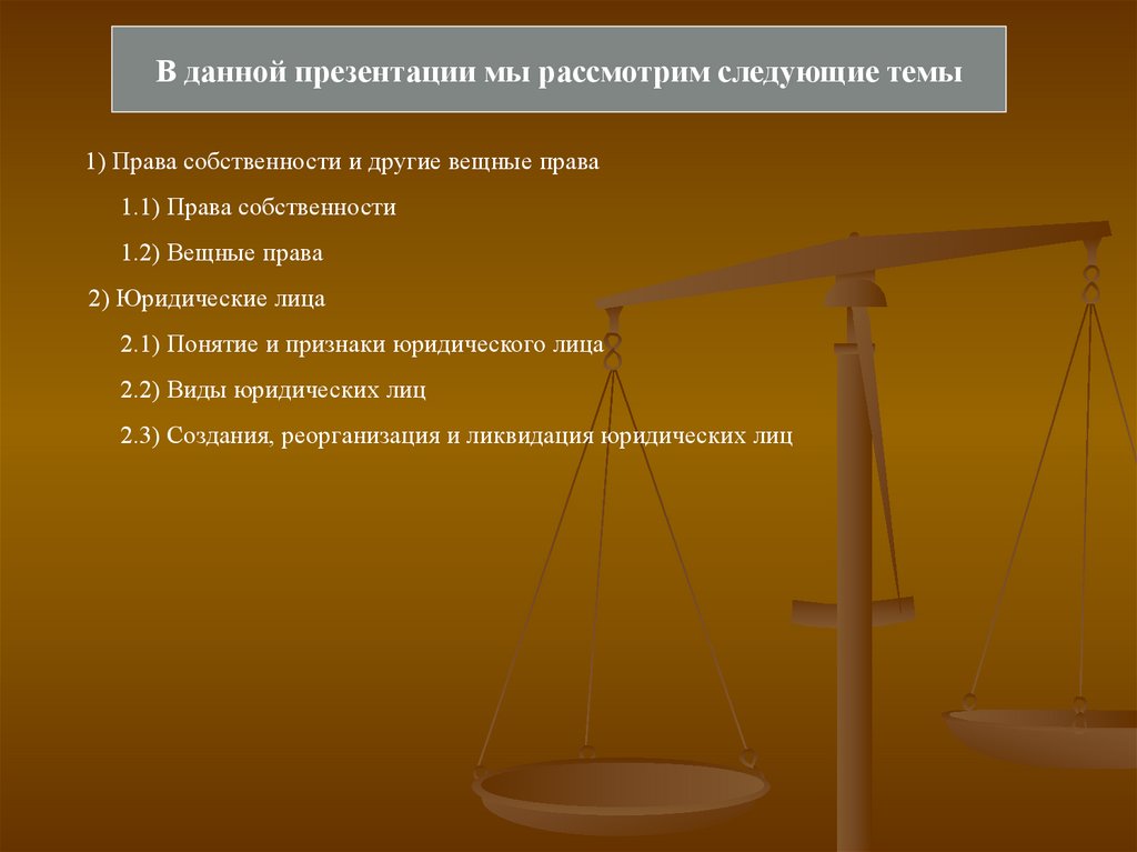 В данной презентации мы рассмотрим следующие темы1) Права собственности и другие вещные права