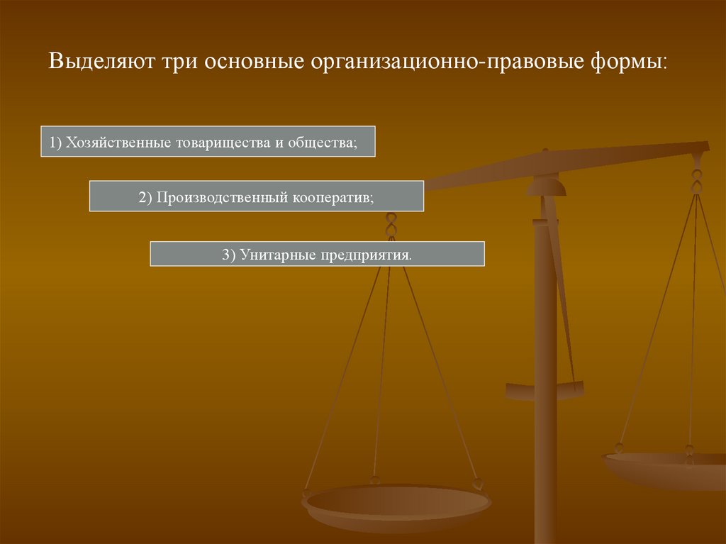 Выделяют три основные организационно-правовые формы:1) Хозяйственные товарищества и общества;