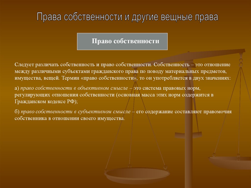 имущества, вещей. Термин «право собственности», то он употребляется в двух значениях: