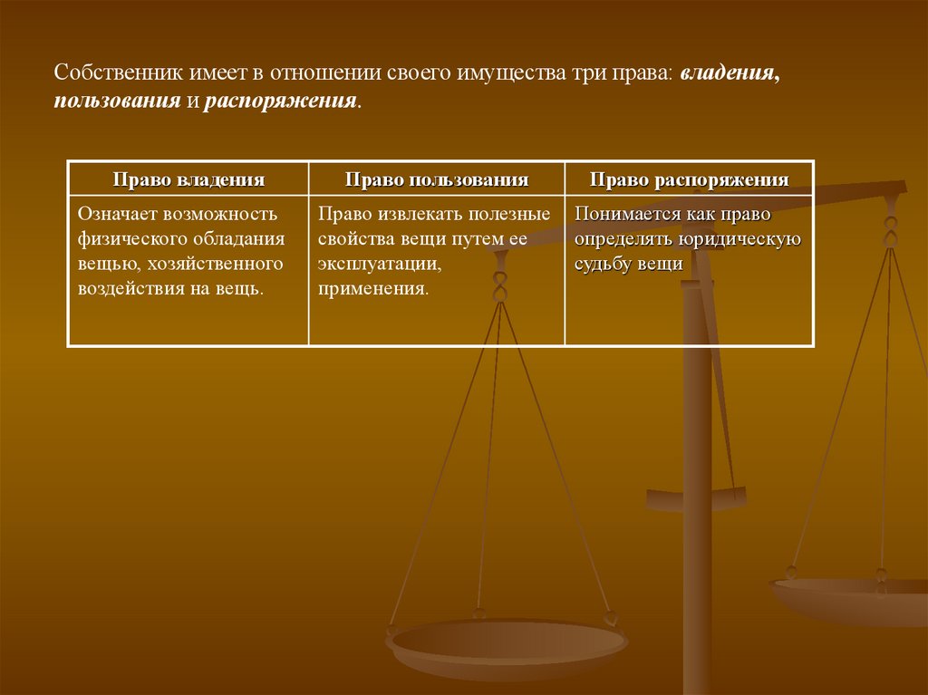 Собственник имеет в отношении своего имущества три права: владения,пользования и распоряжения.