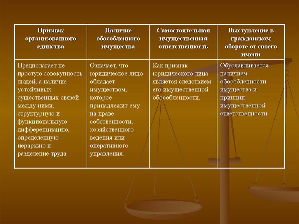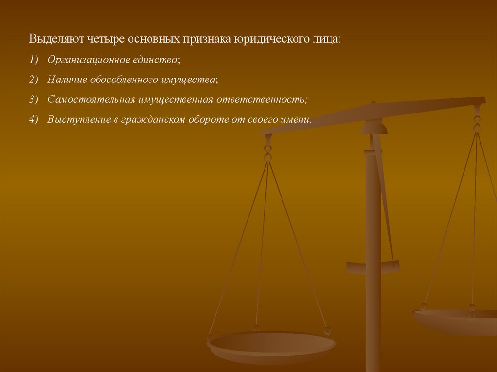 Выделяют четыре основных признака юридического лица:1) Организационное единство;