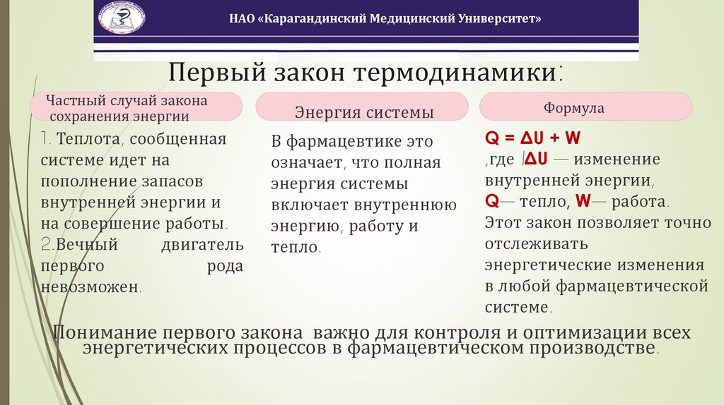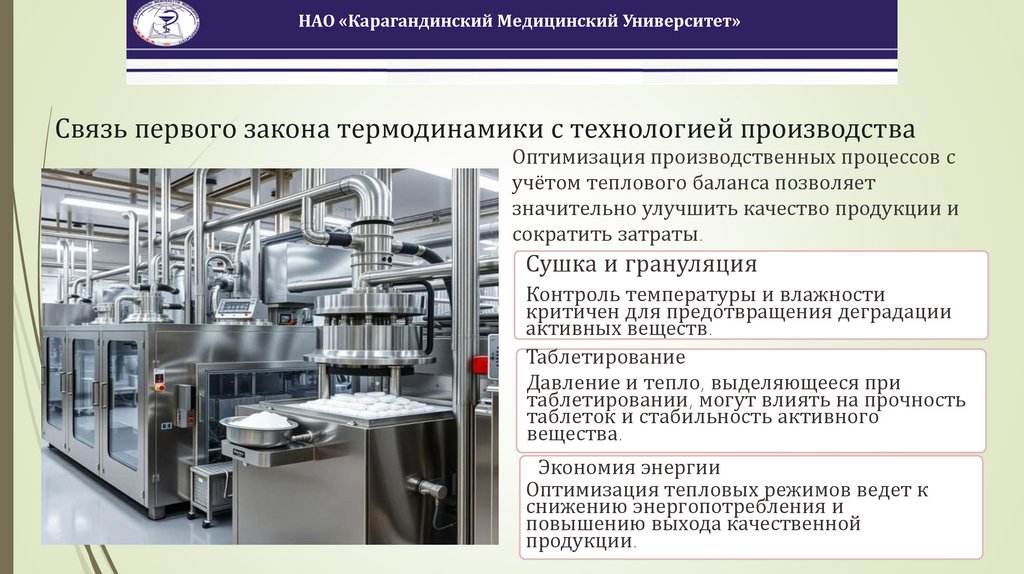 НАО «Карагандинский Медицинский Университет»Связь первого закона термодинамики с технологией производства