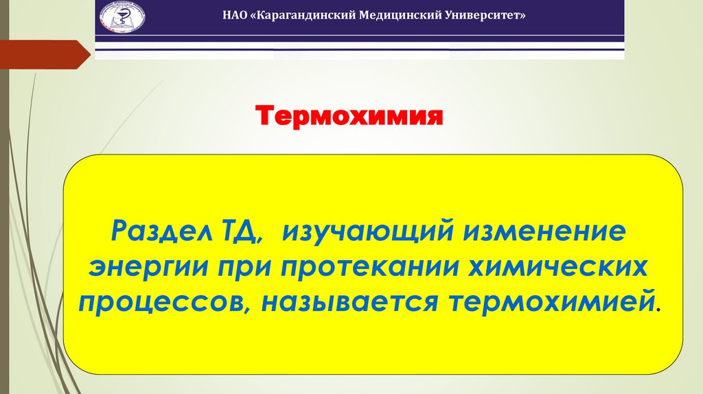 НАО «Карагандинский Медицинский Университет»Основные понятия химической термодинамики
