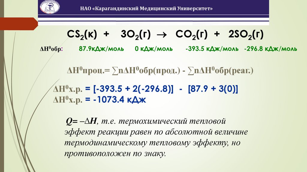 НАО «Карагандинский Медицинский Университет»Закон Гесса и его следствия применяют в научной