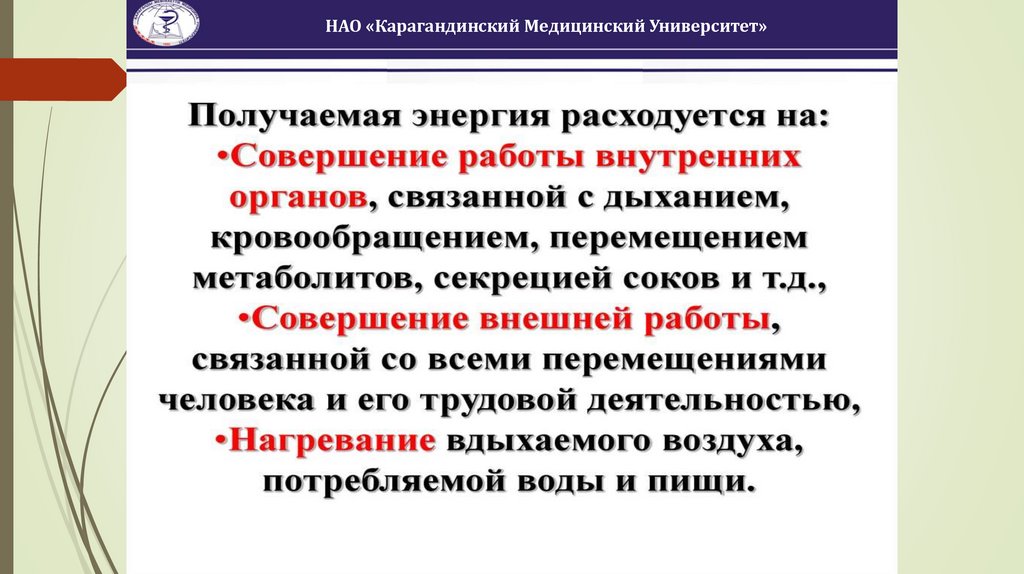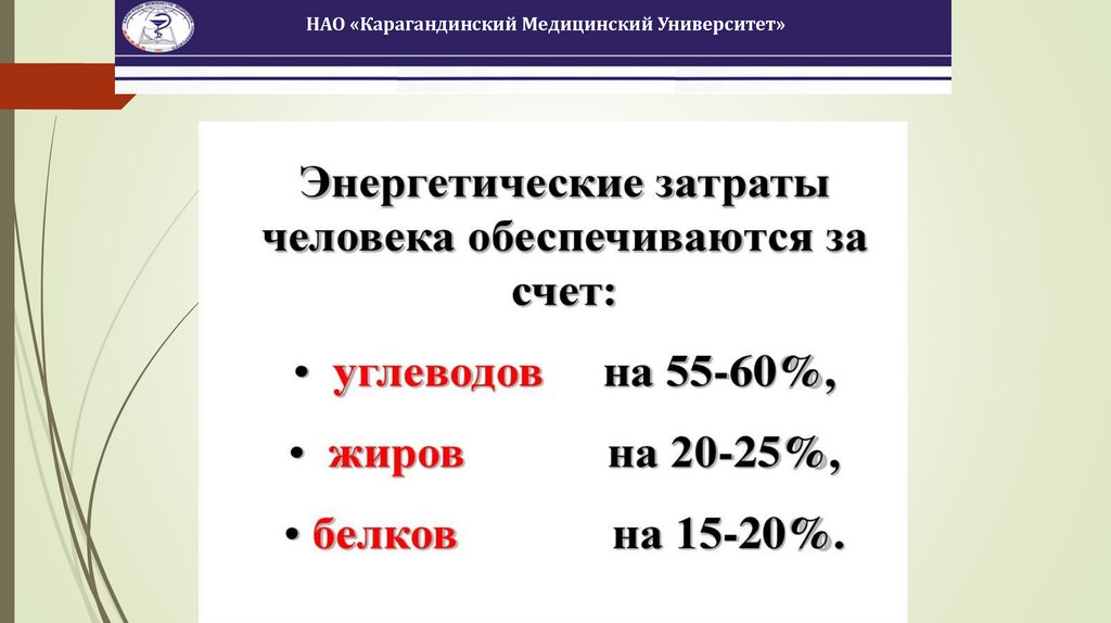 НАО «Карагандинский Медицинский Университет»Суточная потребность человека в энергии