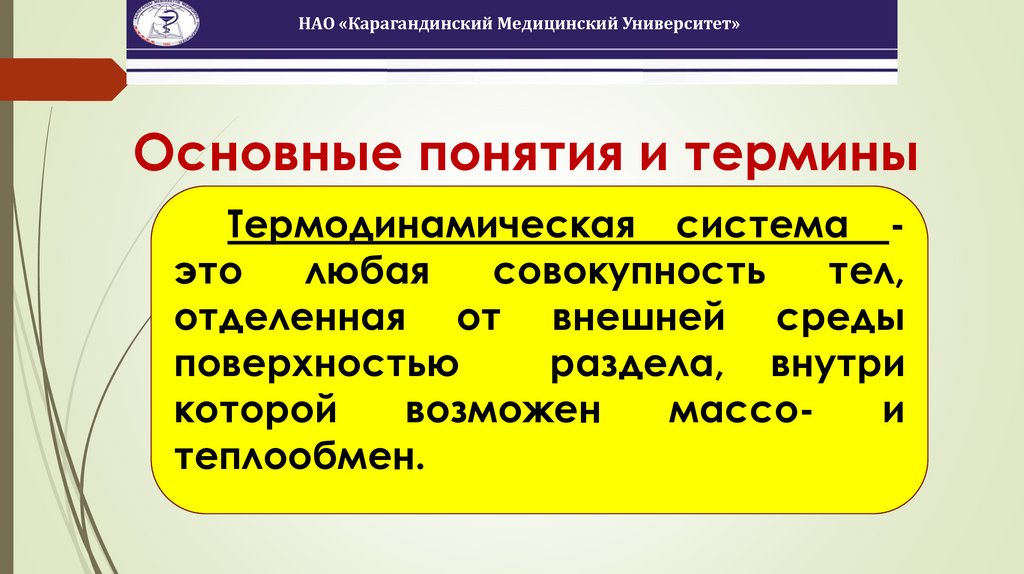 НАО «Карагандинский Медицинский Университет»Основные понятия термодинамики