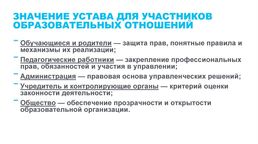 ЗНАЧЕНИЕ УСТАВА ДЛЯ УЧАСТНИКОВОБРАЗОВАТЕЛЬНЫХ ОТНОШЕНИЙ