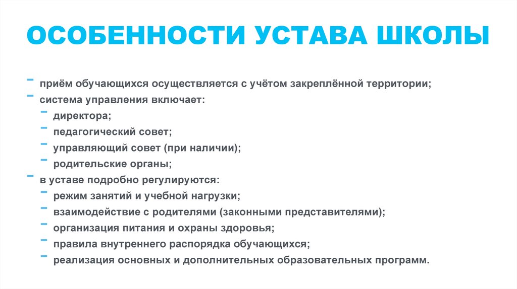 ОСОБЕННОСТИ УСТАВА ШКОЛЫ- приём обучающихся осуществляется с учётом закреплённой территории;