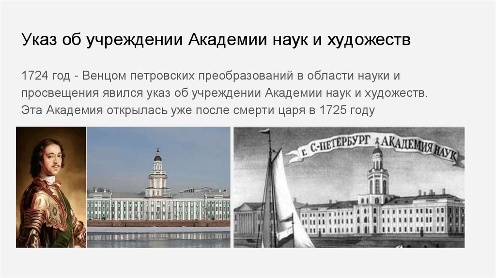 Указ об учреждении Академии наук и художеств1724 год - Венцом петровских преобразований в области науки и