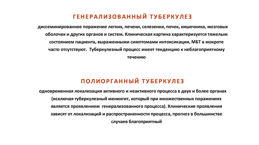 • Туберкулез мозговых оболочек и центральной нервной системы• Туберкулез кишечника, брюшины и брыжеечных лимфатических узлов