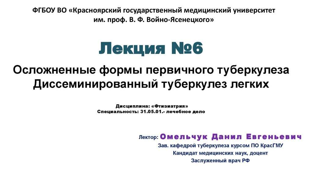 1. Лекция №6 Осложненные формы первичного туберкулеза Диссеминированный туберкулез легких Дисциплина: «Фтизиатрия» Специальность: