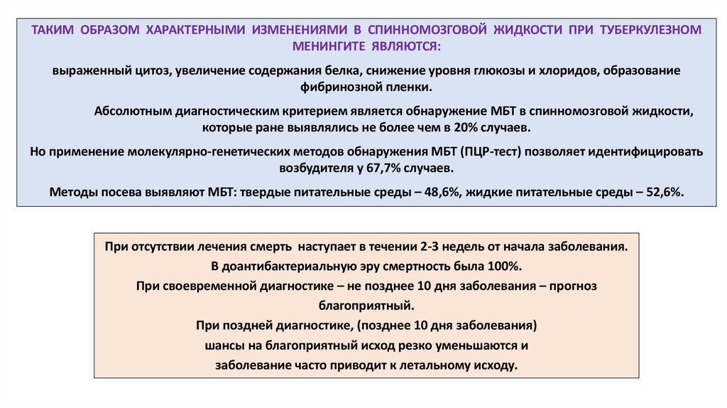 Абсолютным диагностическим критерием является обнаружение МБТ в спинномозговой жидкости,