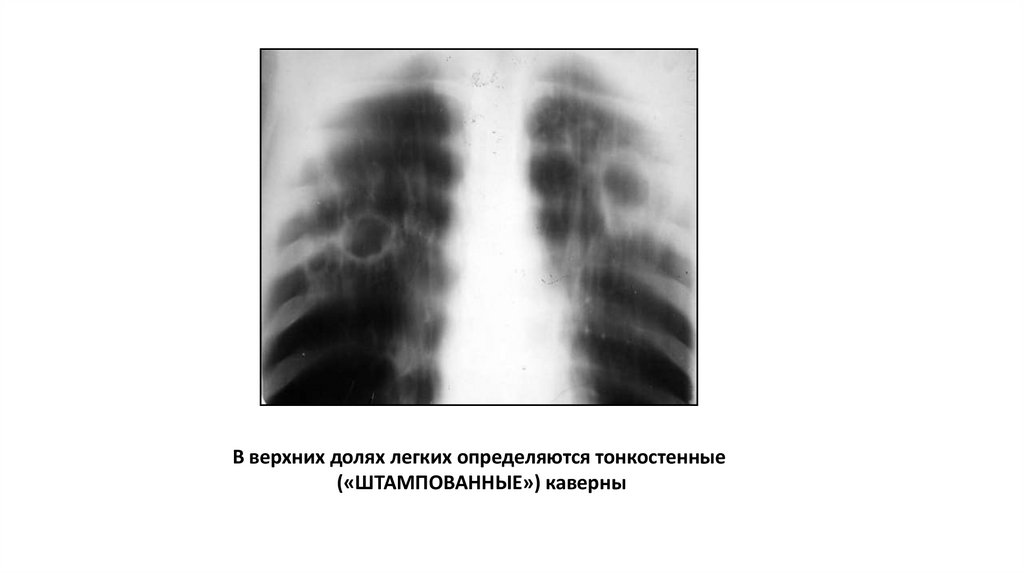 В верхних долях легких определяются тонкостенные(«ШТАМПОВАННЫЕ») каверны