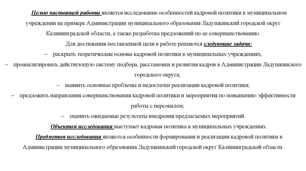 Целью настоящей работы является исследование особенностей кадровой политики в муниципальномучреждении на примере Администрации муниципального образования Ладушкинский городской округ